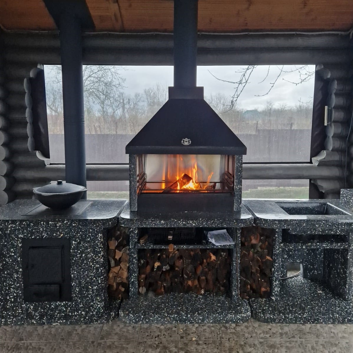Создайте зону для шашлыка на даче добавив печь под казан в фактуре “”Ночное небо”” Габбро-диабаз и мрамор создают чёрно-белый контраст, а чугунная плита и зольник делают печь функциональной.Преимущества:✔️ Равномерное томление — благодаря металлической топке.✔️ Безопасность — можно ставить рядом с деревянными конструкциями.✔️ Габариты — 1100×850×700 мм (компактно для небольших участков).